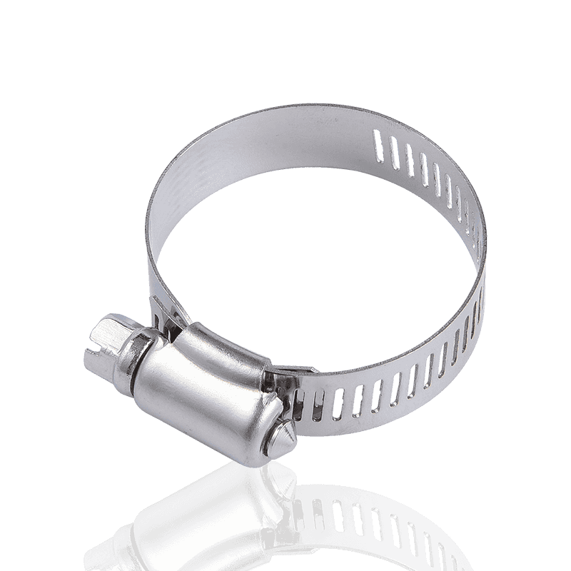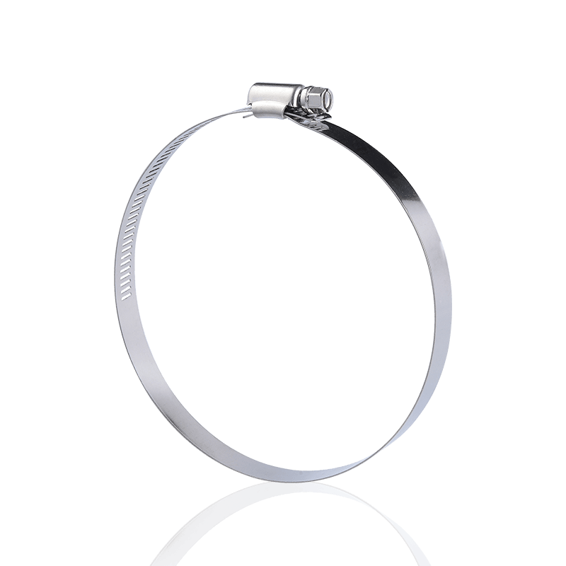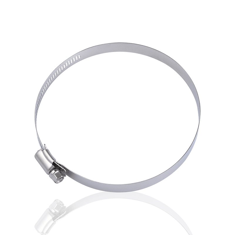 ทำจากสแตนเลสคุณภาพสูง มีคุณสมบัติป้องกันสนิมและป้องกันการกัดกร่อนได้ดีเยี่ยม แม้ว่าจะใช้เป็นเวลานานในสภาพแวดล้อมที่รุนแรง เช่น ความชื้น กรด และด่าง แต่ก็สามารถรักษาพื้นผิวให้เรียบ ป้องกันสนิมและความเสียหายได้อย่างมีประสิทธิภาพ และยืดอายุการใช้งาน ด้วยกระบวนการตอกรูทะลุ ร่องกัดบนสายพานเหล็กจะถูกกลวงออก ซึ่งไม่เพียงช่วยลดน้ำหนักโดยรวม แต่ยังช่วยให้ฟันของสกรูฝังแน่นอยู่ในร่องอีกด้วย การออกแบบนี้ให้แรงกัดที่แข็งแกร่งขึ้นเมื่อทำการล็อค ทำให้มั่นใจได้ถึงความแน่นและการปิดผนึกของการเชื่อมต่อ